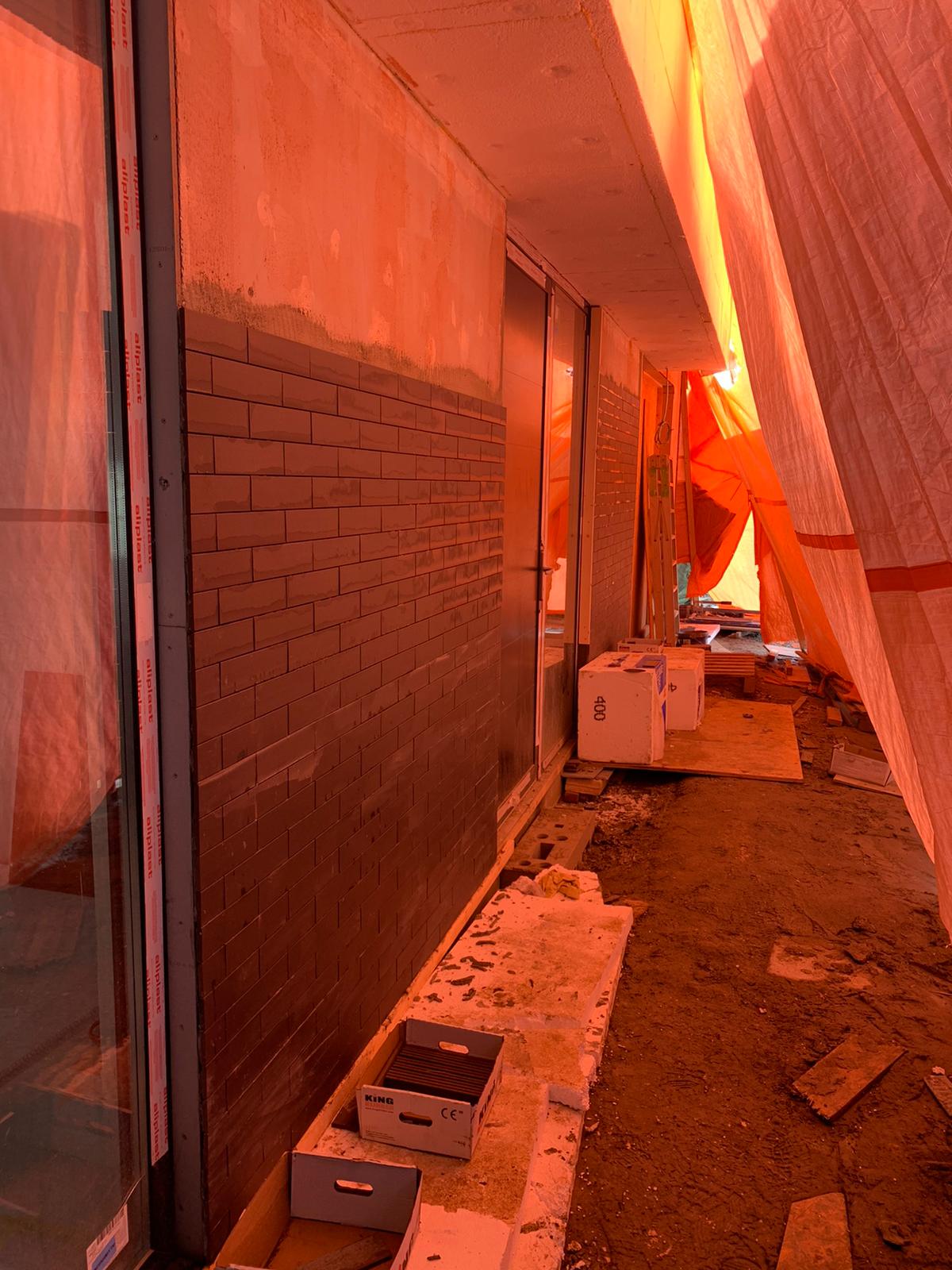 Ondanks onstuimig herfstweer, wordt in weer wind gewerkt om de gevelbekleding aan te brengen. De woning is in Sipspanelen opgetrokken, met een eps toplaag waar stucwerk komt, met paneelvulling...