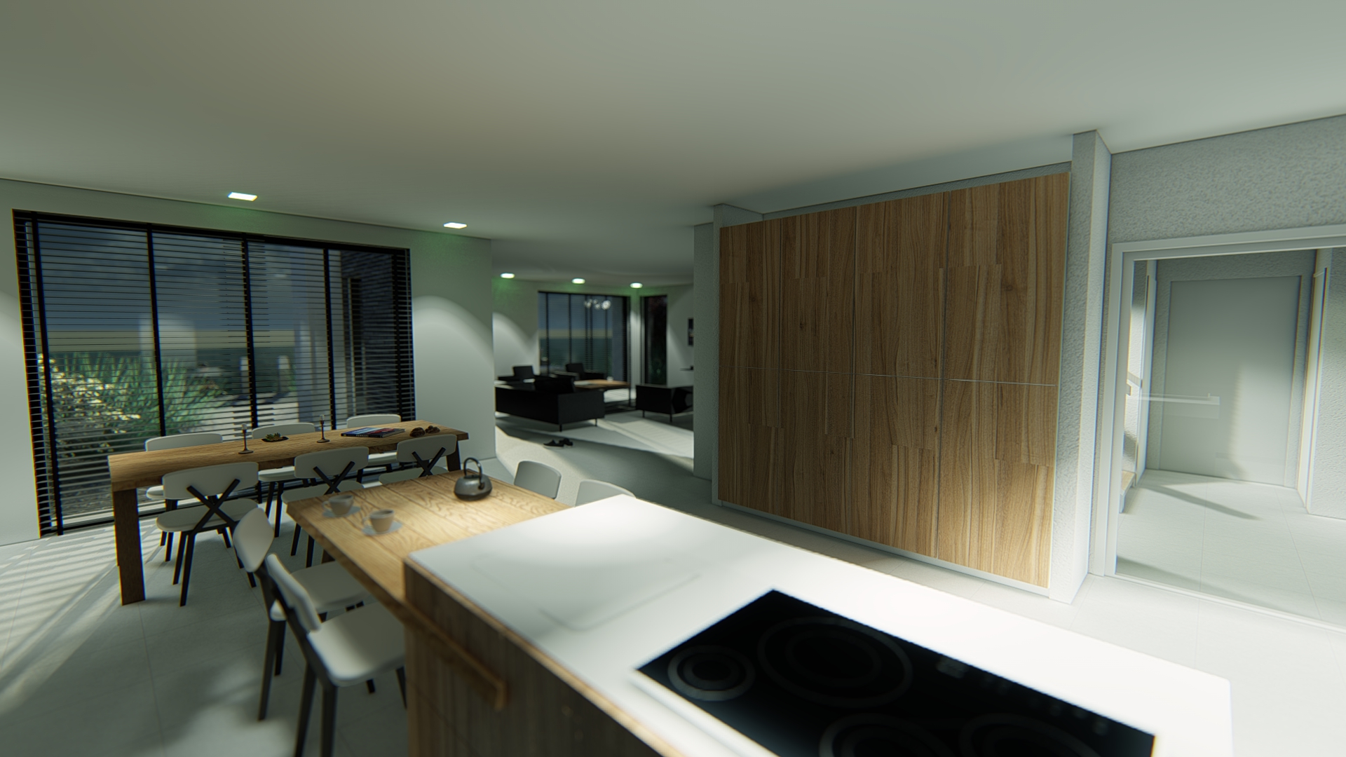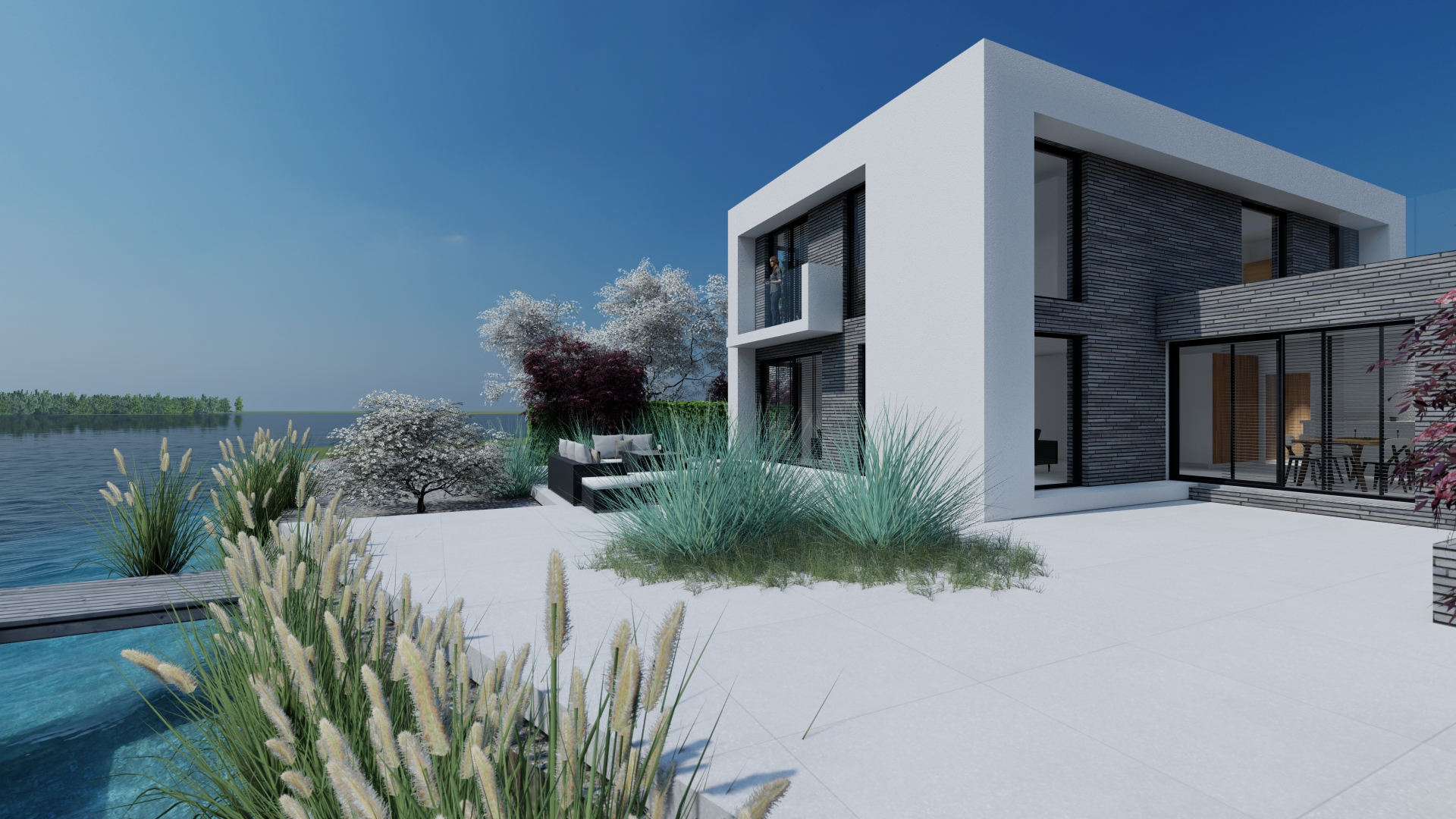 Vrijstaande woning aan het water, met strakke vormgeving. Deze woning is op een evenwichtsfundatie opgetrokken met geprefabriceerde SIPS panelen. De vlakken zijn opgedikt met EPS blokken die afgestucd zijn, et een vlakverdeling van streenstrips.