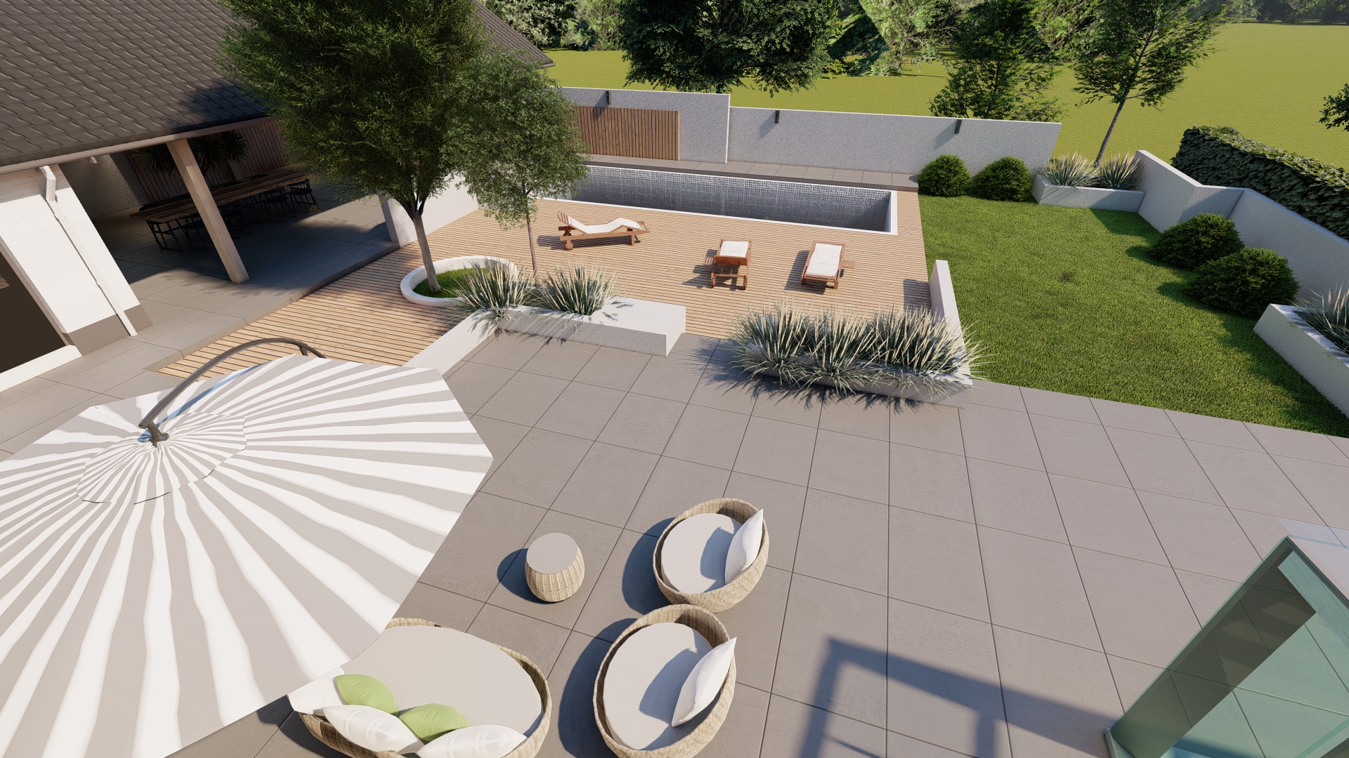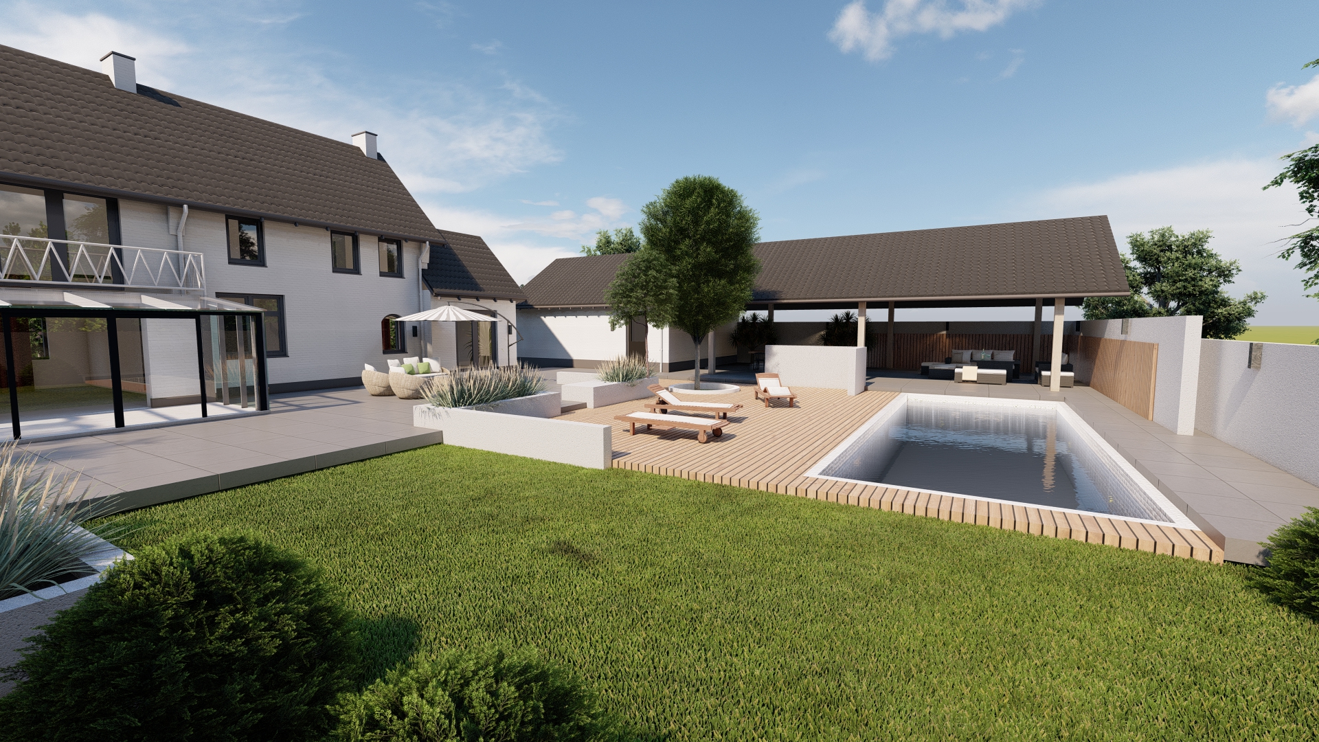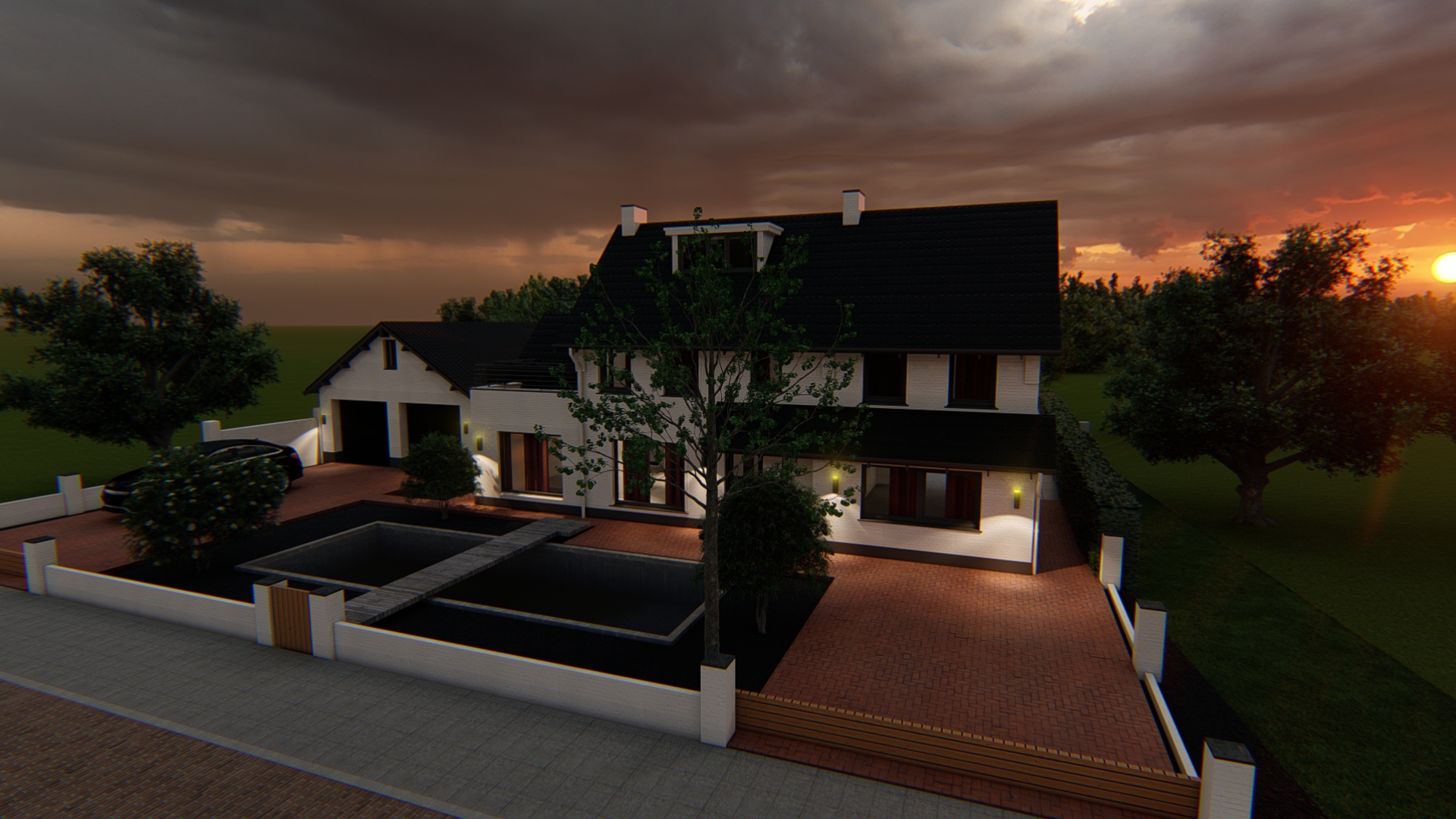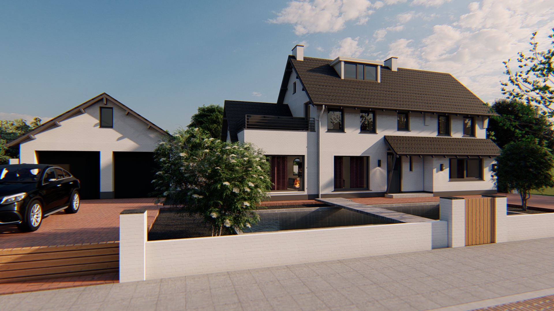 De bestaande woning krijgt een opbouw en een uitbouw, en wordt verder volledig gerenoveerd. Het terreinplan voor en achter met een dubbele garage met een luxueus terreininrichting maakt de woning imposanter zonder het karakter van de ontwerp te verliezen